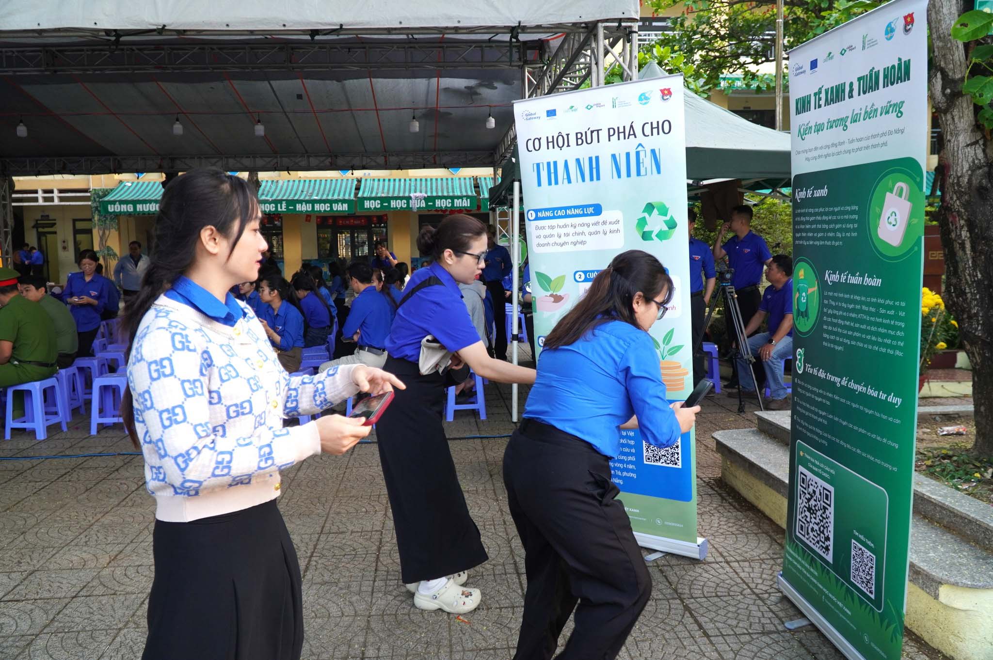 Đoàn viên tìm hiểu nội dung về kinh tế xanh, kinh tế tuần hoàn và quét mã QR để tham gia đố vui có thưởng